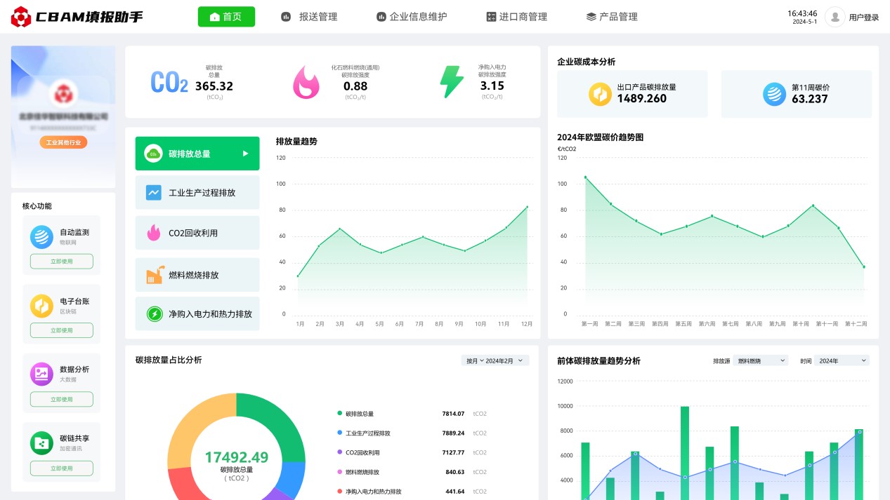 2023年10月1日起,歐盟碳邊境調(diào)整機制(CBAM)已進入過渡期,CBAM涵蓋范圍的出口產(chǎn)品需按時提交產(chǎn)品碳排放報告,未提交報告的企業(yè)將面臨高額處罰。為解決企業(yè)由于官方政策文件理解難度大,專業(yè)門檻高,數(shù)據(jù)搜集難度大,部分數(shù)據(jù)缺失無法填等困擾,推出碳關稅管理平臺(CBAM填報助手),通過數(shù)字化方式,為企業(yè)提供碳數(shù)據(jù)填報、碳數(shù)據(jù)核算、碳數(shù)據(jù)報送、碳數(shù)據(jù)認證、咨詢培訓等全流程服務。可極大減少企業(yè)碳排放報送門檻,助力企業(yè)低成本合規(guī)報送碳排放數(shù)據(jù)。